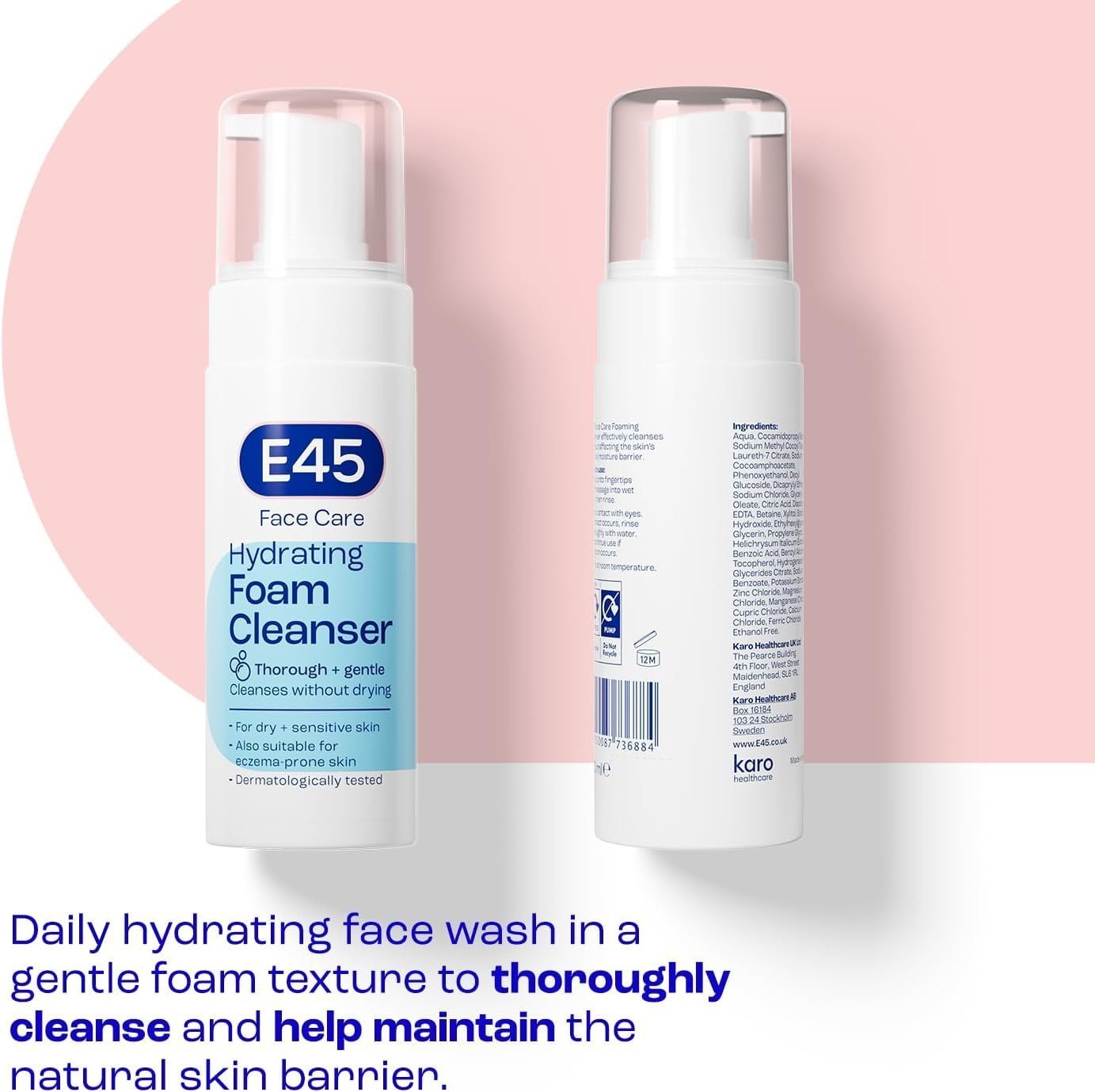 • HOW TO USE – Pump the cleanser onto the fingertips and massage into wet skin, then rinse. Use twice a day: morning and night and we recommend using the E45 Face Moisturiser after for long-lasting softness. The E45 Face Foaming Cleanser has been specially formulated to be used on dry and sensitive skin. Also suitable for those prone to eczema and dermatitis.