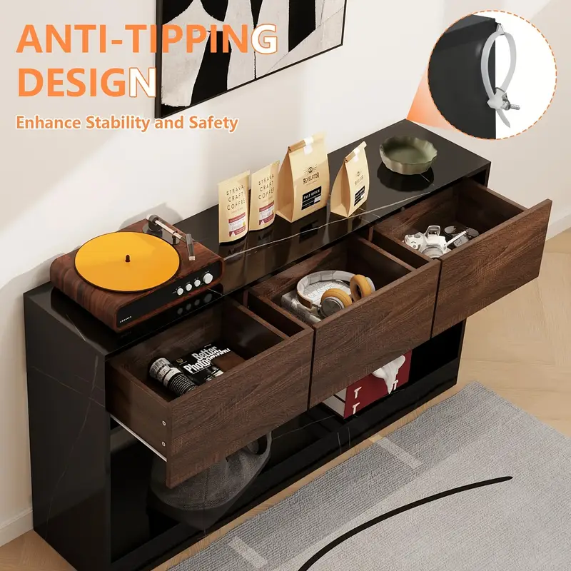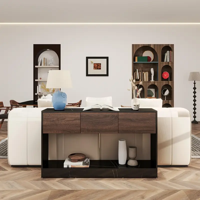 Add timeless sophistication to your space with the Elegant Black Marble Console Table. Measuring 51 inches long, this narrow table is perfect for entryways, hallways, or living rooms. Its classic design, crafted from engineered wood, combines durability with a sleek black marble finish. Multifunctional and practical, it offers storage options to keep your essentials organized while enhancing your décor. Ideal for modern or traditional interiors, this console table is a perfect balance of form and function. With no electricity required, it is a stylish and eco-friendly choice for any home. A product by TYBOATLE, known for quality and elegance.