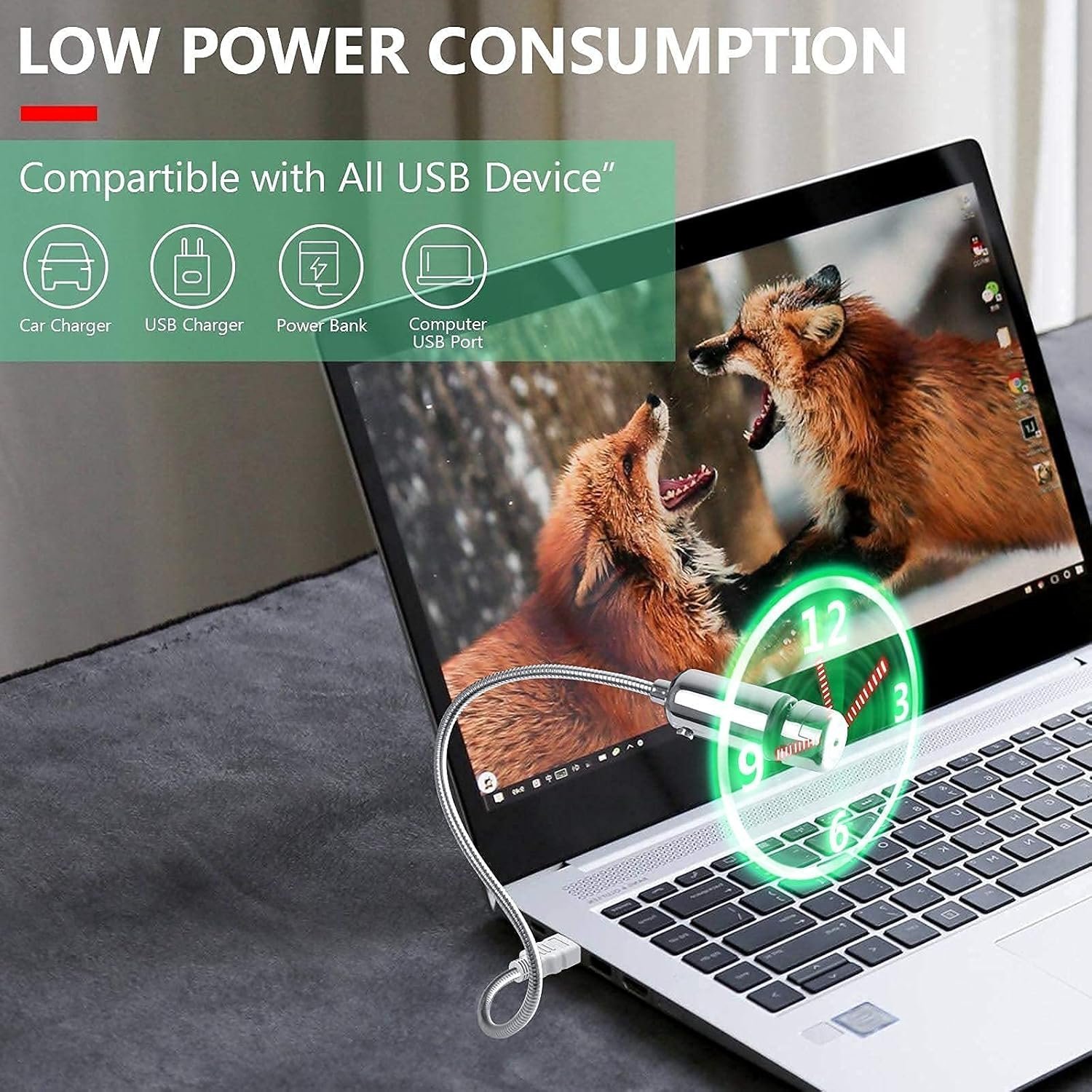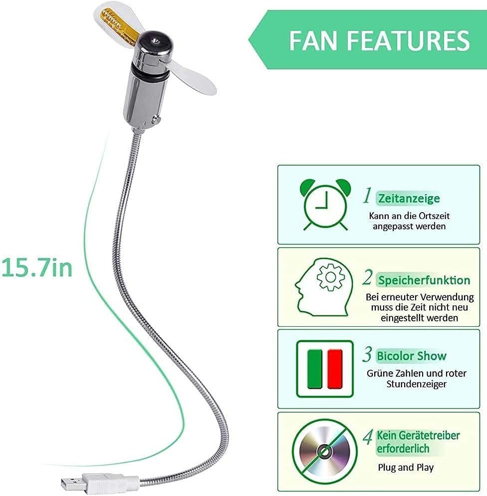 - LOW POWER USB FAN: USB powered fan, low power consumption. Simply plug into any USB port on notebook, PC, Power bank or USB adapter. Plug and play, one-key start. The LED clock will automatically load within 20 seconds. Even if unplugged from the USB port can also maintain time.